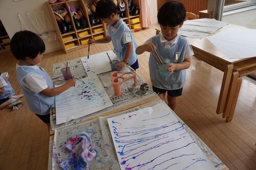 今日で5月が終わるね! 明日から6月だね♪ と、すみれさんはとっても楽しみにしています!! それはなぜかと言うと…6月になるとプールが始まるから!!だそうです(*^_^*) そんなすみれぐみさん、今日は6月の梅雨をイメージして 雨の絵画を作りました☆ 絵…